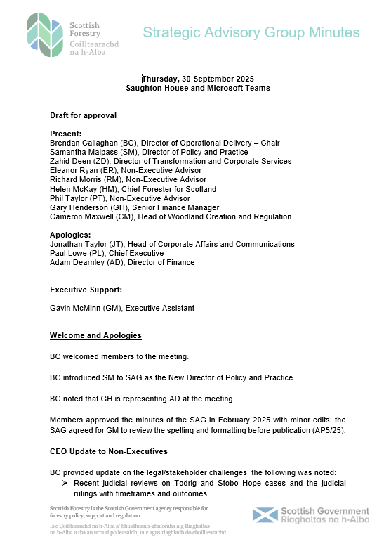 Approved minutes from the Scottish Forestry Strategic Advisory Group meeting on 30 September 2025.