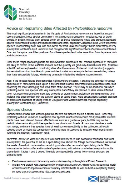 Advice on replanting sites affected by Phytophthora ramorum Last updated :28 Oct 2024 Topic: Manage forests Sub topic: Tree Health Advice on what and when to plant on cleared sites affected by Phytophthora ramorum Advice on replanting sites affected by Phytophthora ramorum PDF | (806.64 KB ) This file might not be suitable for users of assistive technology. Please contact us to request an alternative format. Share this page with others Copy link Email LinkedIn Facebook X formerly Twitter