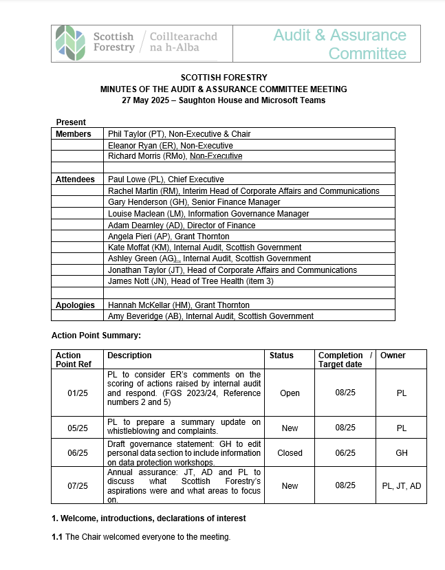 Audit and Assurance Committee minutes 27 May 2025 Last updated :29 Nov 2025 Topic: About Sub topic: Audit and Assurance Committee Minutes of the Audit and Assurance Committee from 27 May 2025. Summary Minutes covered include:Welcome, introductions, declarations of interestMinutes, actions and matters arisingAudit recommendations updateLosses paymentsDraft governance statementInternal Audit Q1 Progress ReportAnnual assurance reportExternal AuditRiskQuarterly Information Governance ReportAOB Audit and Assurance Committee minutes 27 May 2025 DOCX | (180.63 KB ) This file might not be suitable for users of assistive technology. Please contact us to request an alternative format. Share this page with others Copy link Email LinkedIn Facebook X formerly Twitter