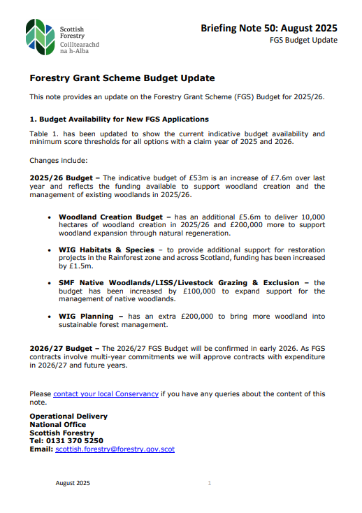 2025/26 Budget – The indicative budget of £53m is an increase of £7.6m over last year and reflects the funding available to support woodland creation and the management of existing woodlands in 2025/26.