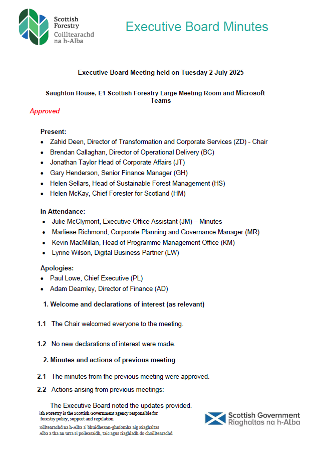 Executive Board minutes - 02 July 2025 Last updated :14 Nov 2025 Topic: About Sub topic: Senior Executive Team Approved minutes from the Executive Board meeting on 02 July 2025 Summary Items discussed included:Welcome and declarations of interestMinutes and actions of previous meetingStanding item: Woodland creation updateStanding item: Finance updateRisk management updateImprovement and Delivery Programme updateCyber Security Action PlanReview of Updated EB Terms of ReferenceAOB Executive Board minutes - 02 July 2025 PDF | (296.72 KB ) This file might not be suitable for users of assistive technology. Please contact us to request an alternative format. Share this page with others Copy link Email LinkedIn Facebook X formerly Twitter