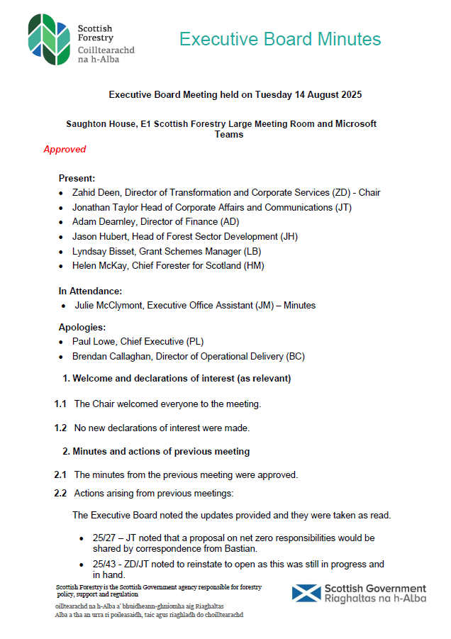 Executive Board minutes - 14 August 2025 Last updated :19 Nov 2025 Topic: About Sub topic: Senior Executive Team Approved minutes from the Executive Board meeting on 14 August 2025. Summary Items discussed included: Welcome and declarations of interestMinutes and actions of previous meetingStanding item: Woodland Creation updateStanding item: Finance updateBusiness Continuity PlanningExecutive Board Planning & Forward LookStakeholder ManagementAOB Executive Board minutes - 14 August 2025 PDF | (312.94 KB ) This file might not be suitable for users of assistive technology. Please contact us to request an alternative format. Share this page with others Copy link Email LinkedIn Facebook X formerly Twitter