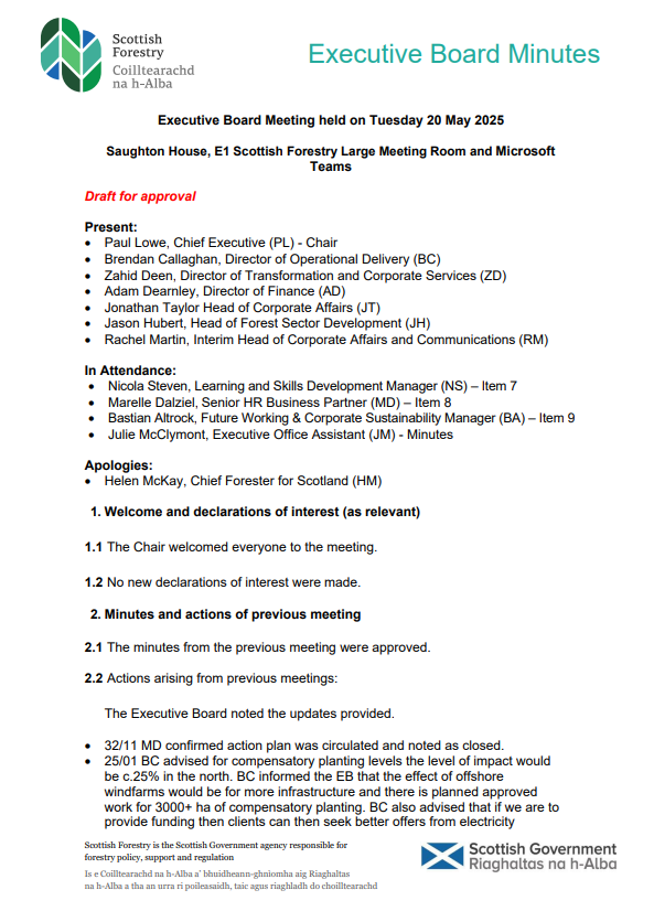 Executive Board minutes - 20 May 2025 Last updated :31 Oct 2025 Topic: About Sub topic: Senior Executive Team Minutes from the Executive Board meeting from May 2025. Summary Items discussed included:Welcome and declarations of interest (as relevant)Minutes and actions of previous meetingStanding item: woodland creation updateStanding Item: Finance UpdateFGS Payments RPIDAI Opportunities, Copilot Chat and M365 Copilot EnterpriseLearning and Skills Development StrategyPeople Survey Update on ActionNet Zero Road MapAOB Executive Board minutes - 20 May 2025 PDF | (225.37 KB ) This file might not be suitable for users of assistive technology. Please contact us to request an alternative format. Share this page with others Copy link Email LinkedIn Facebook X formerly Twitter