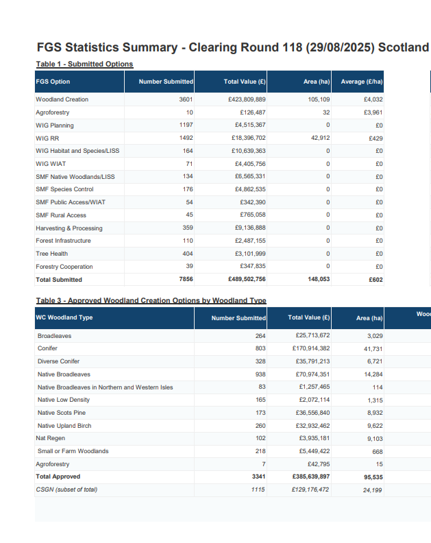 Forestry Grant Scheme Statistics - August 2025 Last updated :28 Oct 2025 Topic: Apply for a grant This is a summary of Forestry Grant Scheme statistics up to August 2025. It shows progress on woodland creation submissions, claims, and approvals across Scotland. Forestry Grant Scheme Statistics - August 2025 PDF | (526.42 KB ) This file might not be suitable for users of assistive technology. Please contact us to request an alternative format. Share this page with others Copy link Email LinkedIn Facebook X formerly Twitter