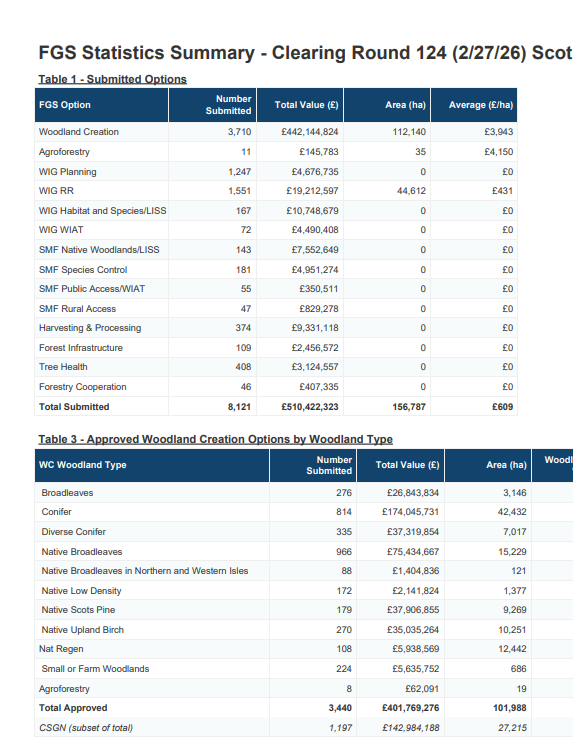 Forestry Grant Scheme Statistics - February 2026 Last updated :12 Mar 2026 Topic: Apply for a grant Forestry Grant Scheme statistics up to February 2026. It shows progress on woodland creation submissions, claims, and approvals across Scotland. Forestry Grant Scheme Statistics - February 2026 PDF | (2.68 MB ) This file might not be suitable for users of assistive technology. Please contact us to request an alternative format. Share this page with others Copy link Email LinkedIn Facebook X formerly Twitter