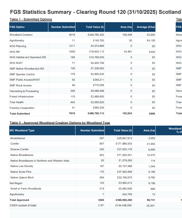 Forestry Grant Scheme Statistics - October 2025 Last updated :29 Nov 2025 Topic: Apply for a grant Forestry Grant Scheme statistics up to October 2025. It shows progress on woodland creation submissions, claims, and approvals across Scotland. Forestry Grant Scheme Statistics - October 2025 PDF | (674.48 KB ) This file might not be suitable for users of assistive technology. Please contact us to request an alternative format. Share this page with others Copy link Email LinkedIn Facebook X formerly Twitter