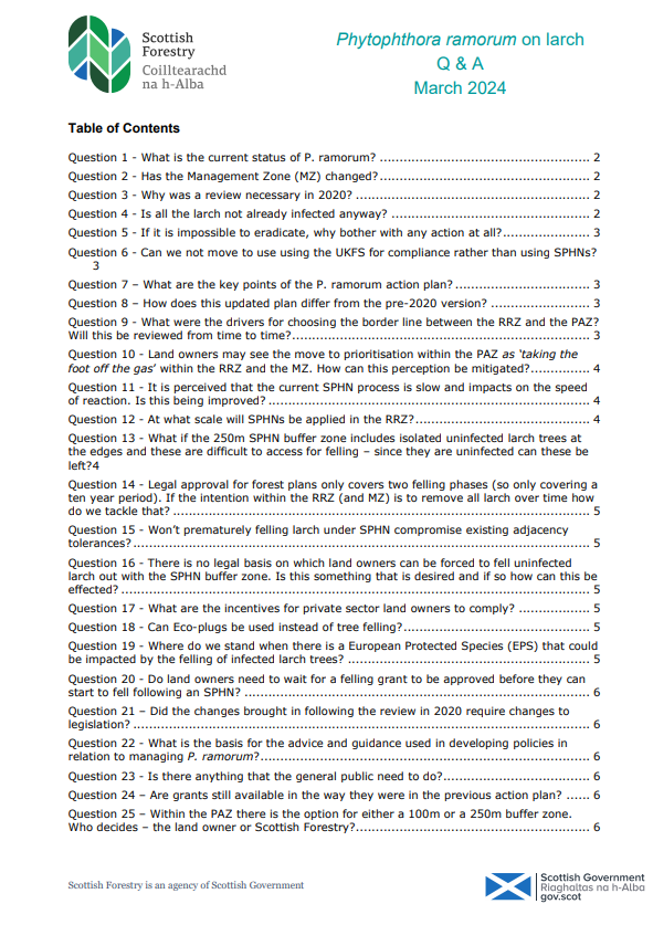 Frequently asked questions: Phytophthora ramorum management policy Last updated :28 Oct 2024 Topic: Manage forests Sub topic: Tree Health A Q&A document giving answers to some frequently asked questions about Scottish Government policy on Phytophthora ramorum management. Last updated in March 2024. Frequently asked questions: Phytophthora ramorum management policy PDF | (330.51 KB ) This file might not be suitable for users of assistive technology. Please contact us to request an alternative format. Share this page with others Copy link Email LinkedIn Facebook X formerly Twitter