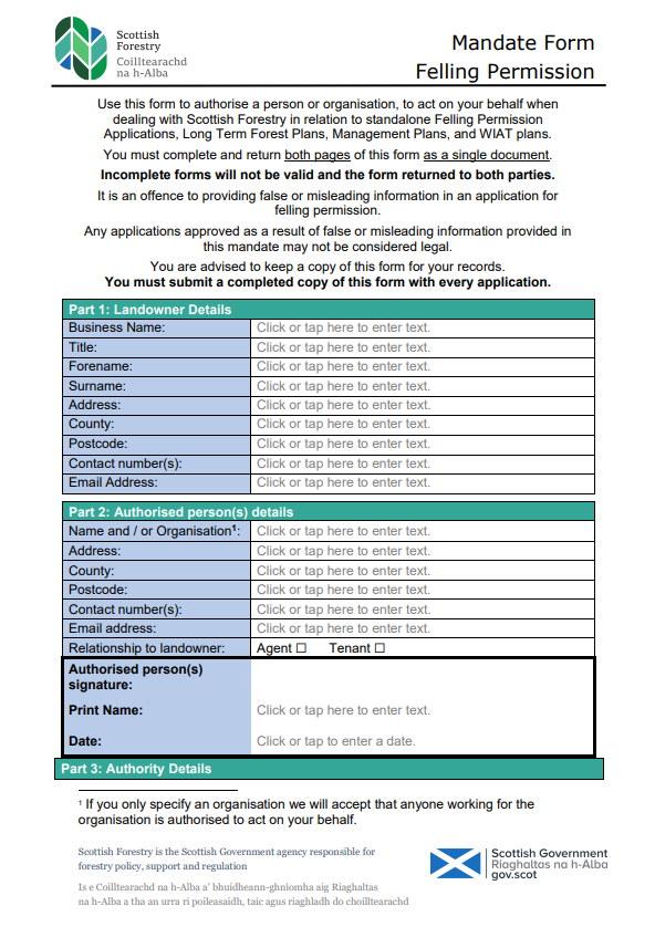 Use this form to provide your agent or representative with authority to act on your behalf when dealing with Scottish Forestry in relation to the submission and management of Felling Permissions.