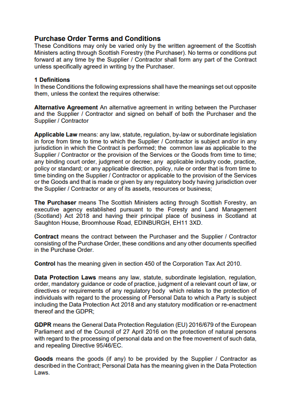Scottish Forestry's Purchase Order Terms and Conditions Last updated :23 Feb 2026 Topic: Using woodlands Sub topic: Forest industry These Conditions may only be varied only by the written agreement of the Scottish Ministers acting through Scottish Forestry (the Purchaser). Summary No terms or conditions put forward at any time by the Supplier / Contractor shall form any part of the Contract unless specifically agreed in writing by the Purchaser.This document was last revised on February 2026. Scottish Forestry's Purchase Order Terms and Conditions PDF | (141.03 KB ) This file might not be suitable for users of assistive technology. Please contact us to request an alternative format. Share this page with others Copy link Email LinkedIn Facebook X formerly Twitter