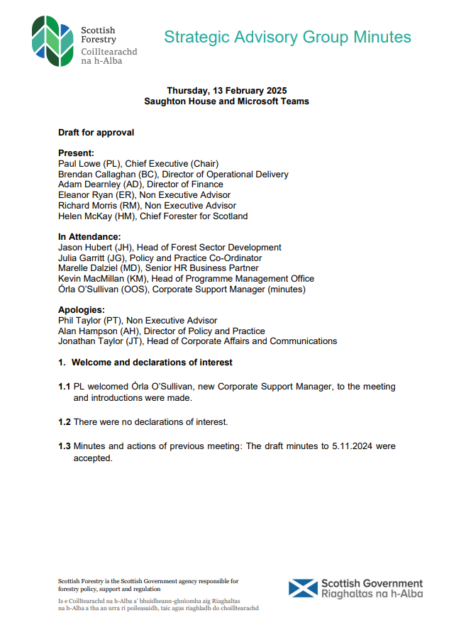 Strategic Advisory Group minutes - February 2025 Last updated :27 Nov 2025 Topic: About Sub topic: Scottish Forestry Strategic Advisory Group Approved minutes from the Scottish Forestry Strategic Advisory Group meeting on 13 February 2025. Summary Items discussed included: Welcome and declarations of interestCEO UpdateReflection post Storm Eowyn and the management of windblowFuture of Scotland's Forestry Strategy and Implementation Plan, and Forestry SummitResults of the 2024 People Survey and next stepsSupporting Women into LeadershipAOCB Strategic Advisory Group minutes - February 2025 PDF | (229.77 KB ) This file might not be suitable for users of assistive technology. Please contact us to request an alternative format. Share this page with others Copy link Email LinkedIn Facebook X formerly Twitter