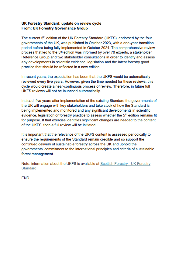 UK Forestry Standard - update on review cycle Last updated :01 Oct 2025 Topic: Manage forests This note outlines the principles and process for the UKFS review cycle going forward from the current 5th edition. Summary In future, full reviews of the UKFS will not be launched automatically every five years. UK Forestry Standard - update on review cycle PDF | (83.87 KB ) This file might not be suitable for users of assistive technology. Please contact us to request an alternative format. Share this page with others Copy link Email LinkedIn Facebook X formerly Twitter